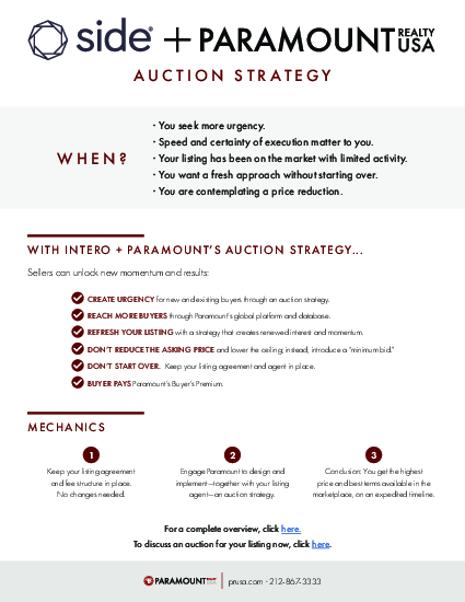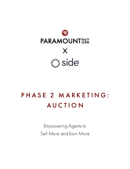 Side partner companies can leverage Paramount Realty USA's auction platform and strategies to sell more and earn more by (a) reaching a wider audience, (b) creating urgency among buyers in the marketplace, and (c) using Paramount's auction strategies to solicit the best offers and terms available in the marketplace.